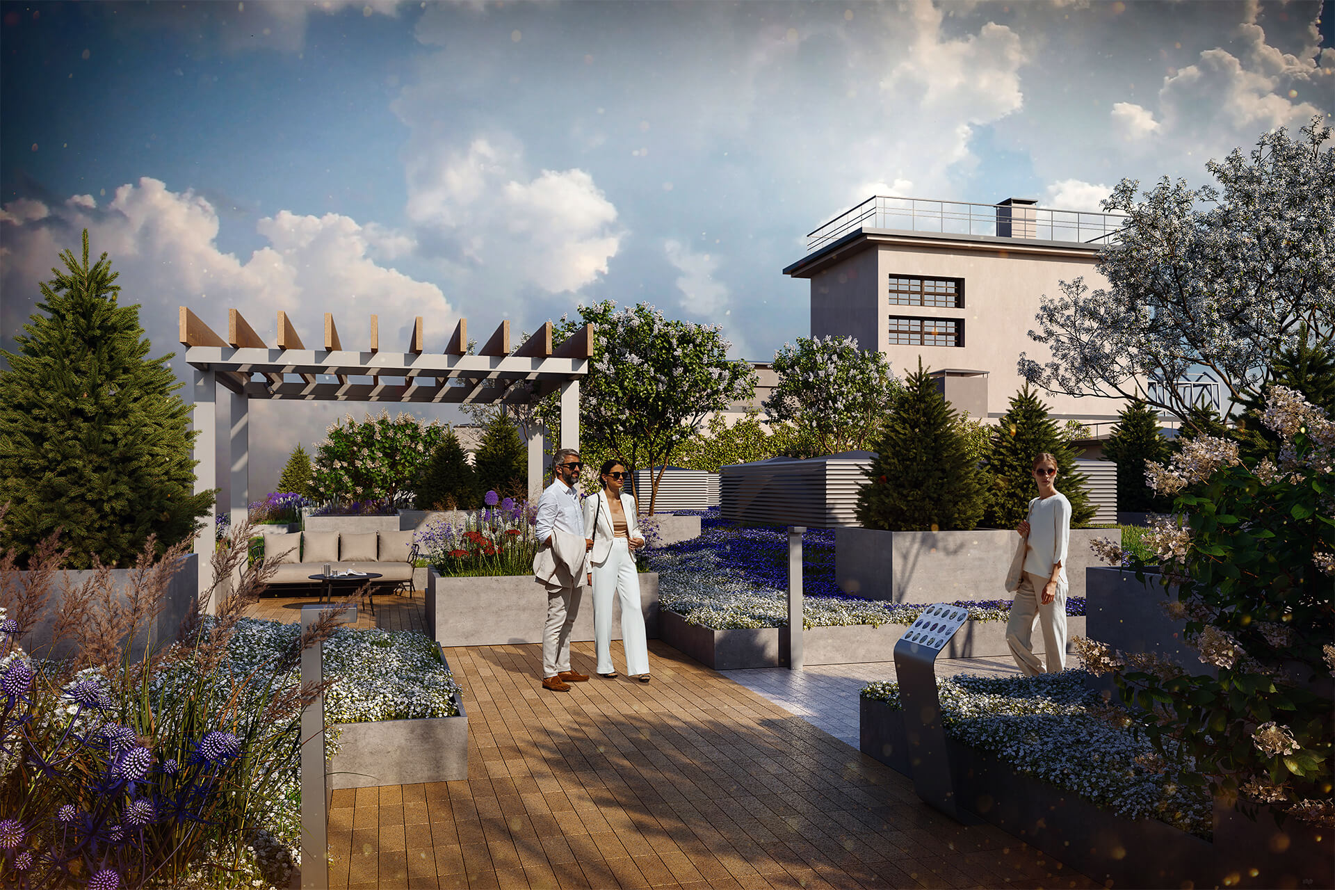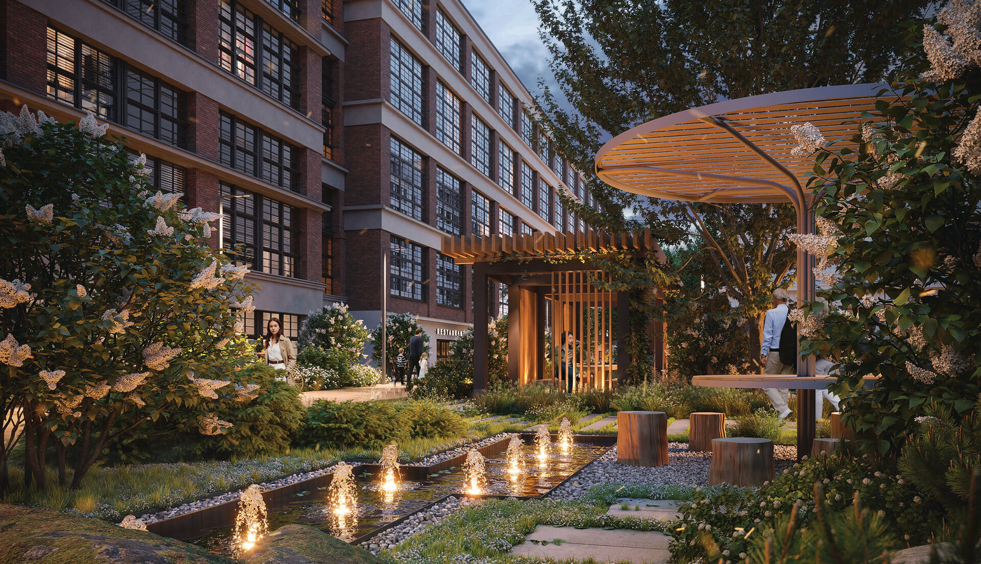 Каждый двор — самостоятельное пространство с собственным характером. Камерные патио, променад с висячими садами, голландский дворик с фонтаном, лужайки, зоны отдыха и детские площадки органично вписаны в природный контекст. Натуральные покрытия, террасная доска, декоративная подсветка и геопластика усиливают эффект уюта и создают многоуровневую среду, приятную для жизни в любое время года.