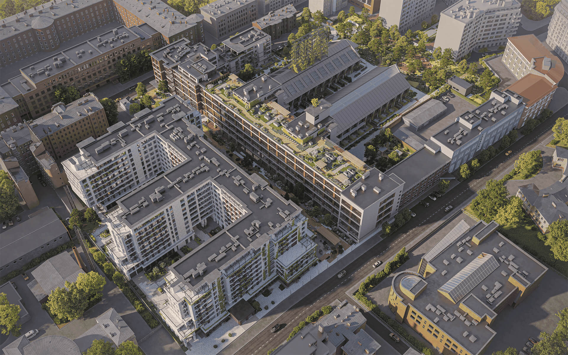 Каждое здание комплекса — Klassik, Balance и Fabrik — предлагает свой набор планировок и интерьеров. В Fabrik расположены апартаменты с индустриальной эстетикой, кирпичными стенами, историческим остеклением и потолками до 5,2 метров. В Klassik и Balance — новые корпуса с элегантными квартирами, мастер-спальнями, видами на террасы, патио и эксплуатируемые кровли. Окна в пол, панорамное остекление, эргономичные планировки и мастер-зоны подчеркивают комфорт и статус жилья.